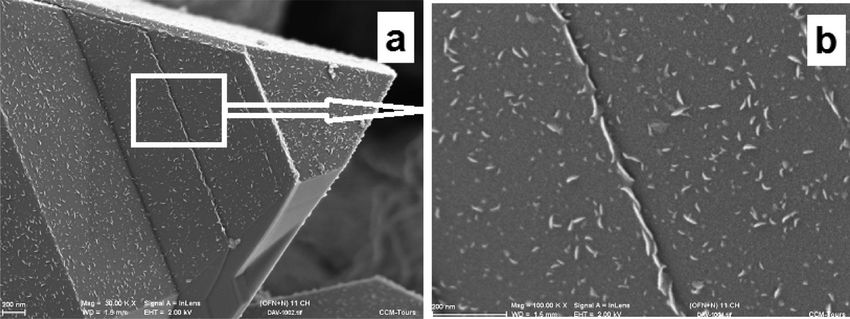 用SEM对钻石的表面形貌进行观察,观察钻石生长表面形成的台阶等特征,用CL附件对钻石产生的荧光波段进行分析,从而判断钻石是否为天然钻石。